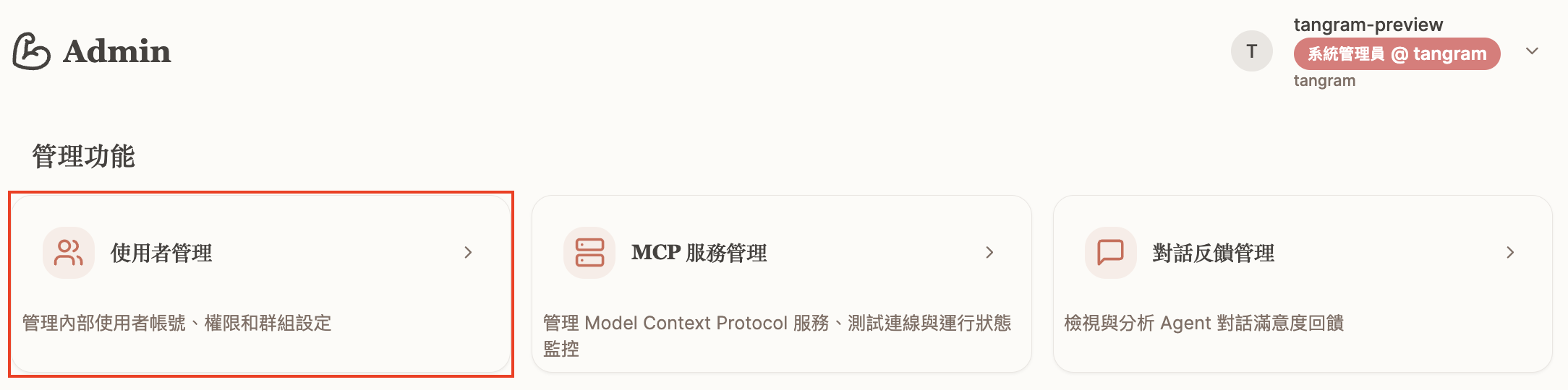 - 權限: 能夠管理所有資源(User、Agent、Knowledgebase)。