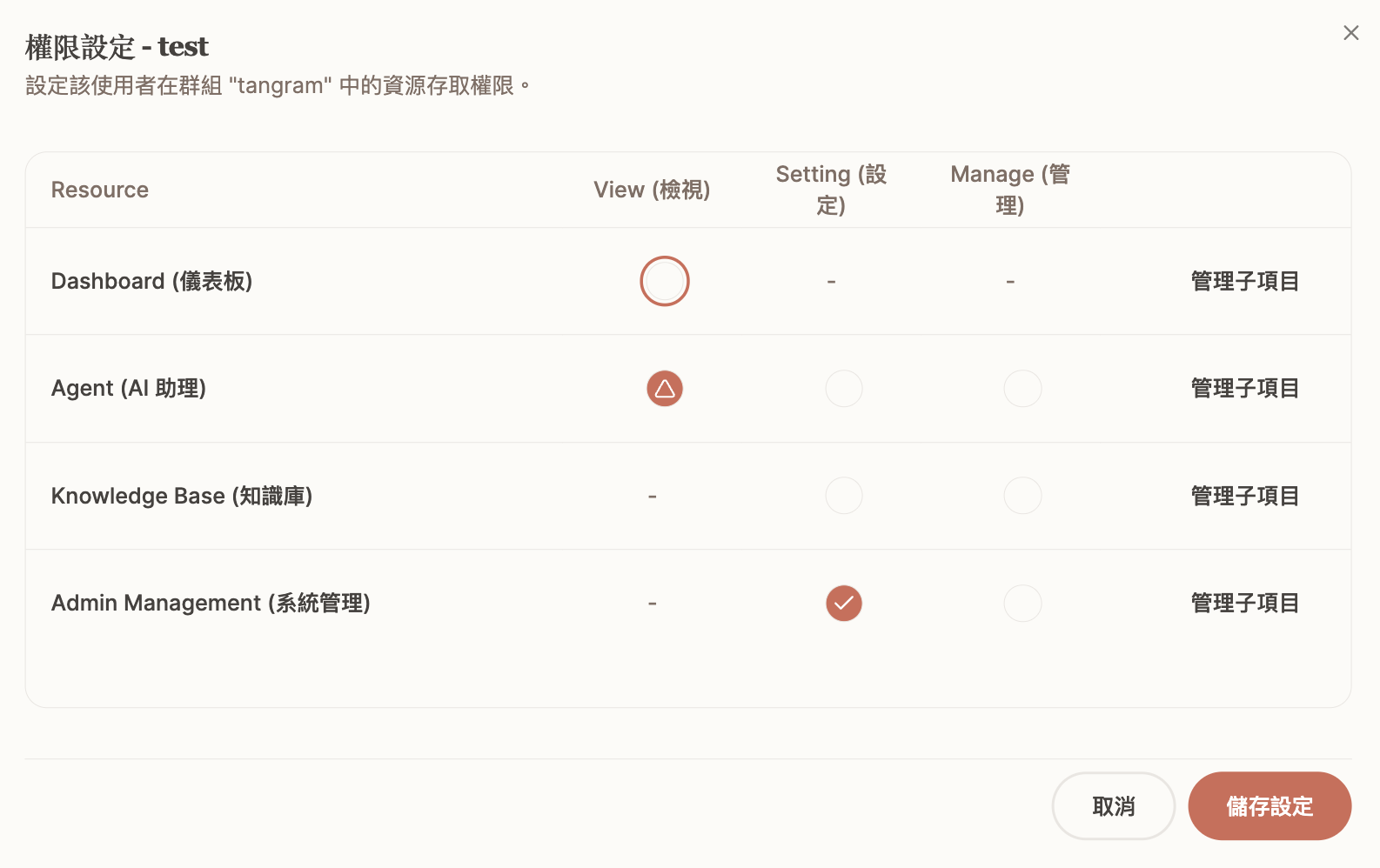 - 顆粒度設定: 資源權限可具備顆粒度設定,例如允許使用者同時擁有 Agent A 的 View 權限和 Agent B 的 Setting 權限。