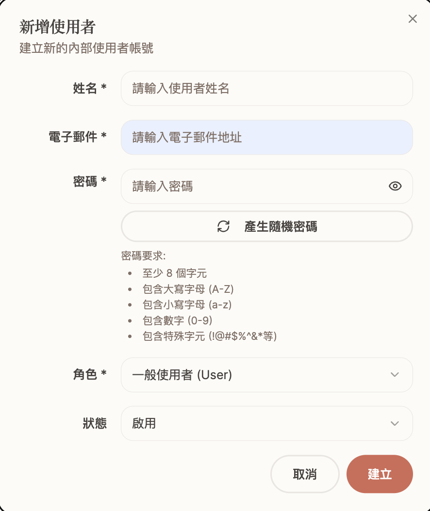 - 自我權限修改限制: 即使使用者擁有 User management / Manage 權限,依然無法修改自己的角色及權限。