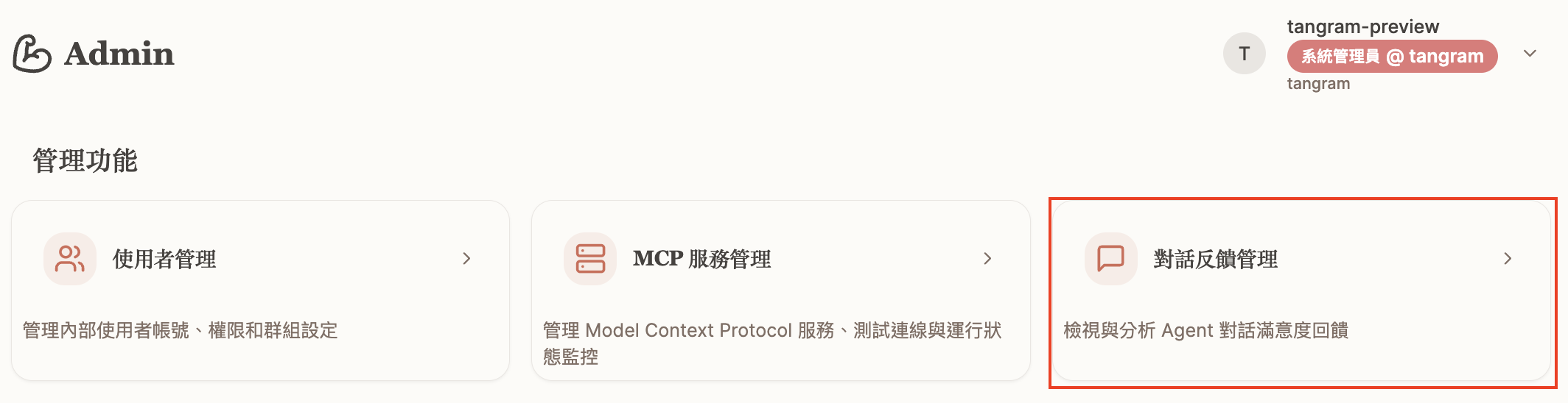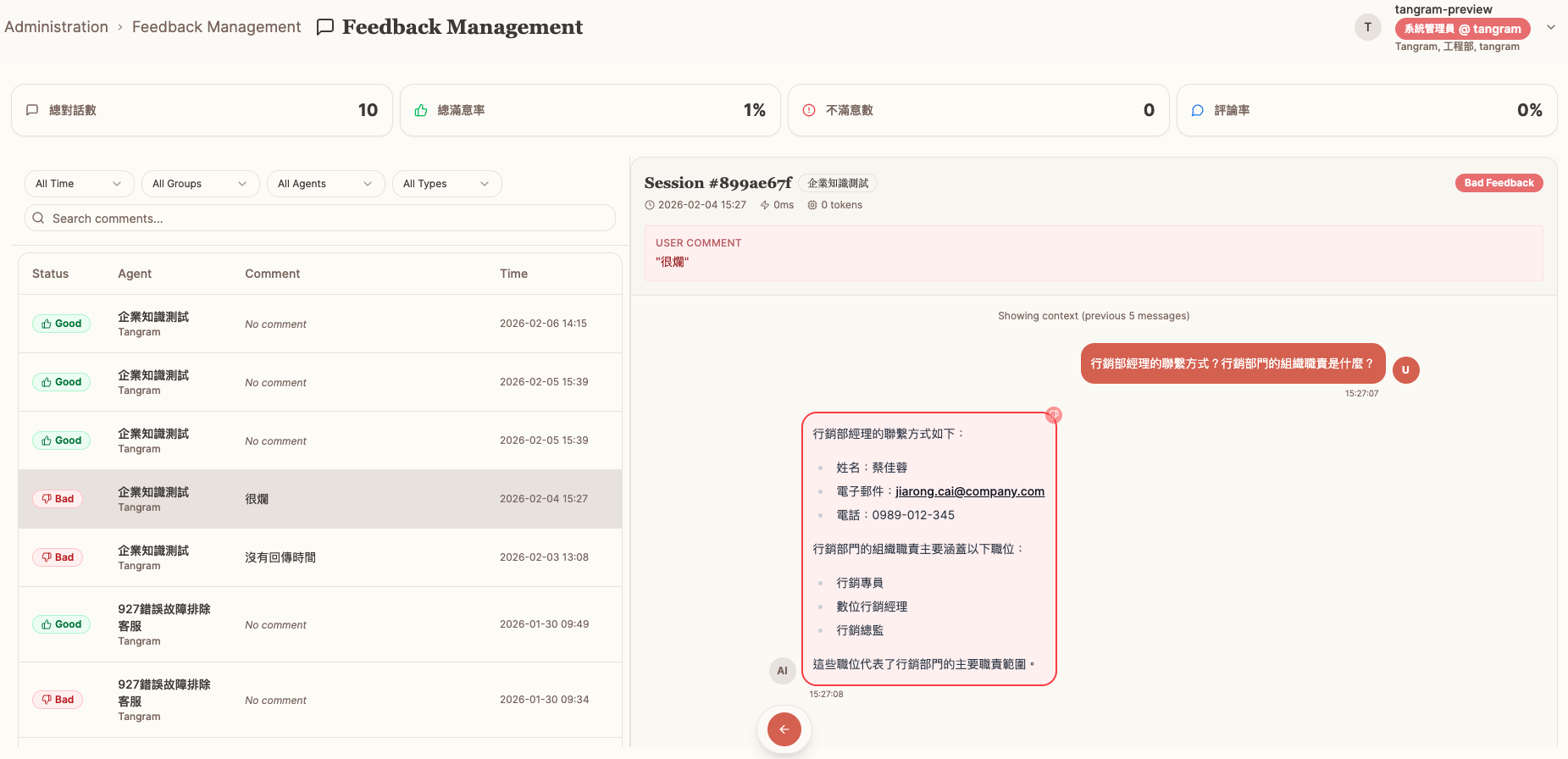 「對話反饋管理」功能旨在提供系統管理員一個集中的介面,以監控和分析所有 Agent 對話中來自使用者的正向(好評)或負向(差評)反饋紀錄。