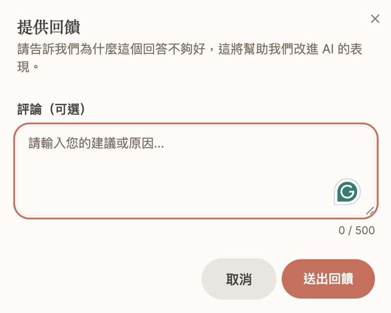 Agent 反饋是使用者在與 Agent 互動結束後,針對 Agent 提供的協助、回應品質與整體滿意度所給予的即時評價。這些反饋紀錄是持續優化 Agent 效能和提升使用者體驗的關鍵依據,主要分為兩種:
