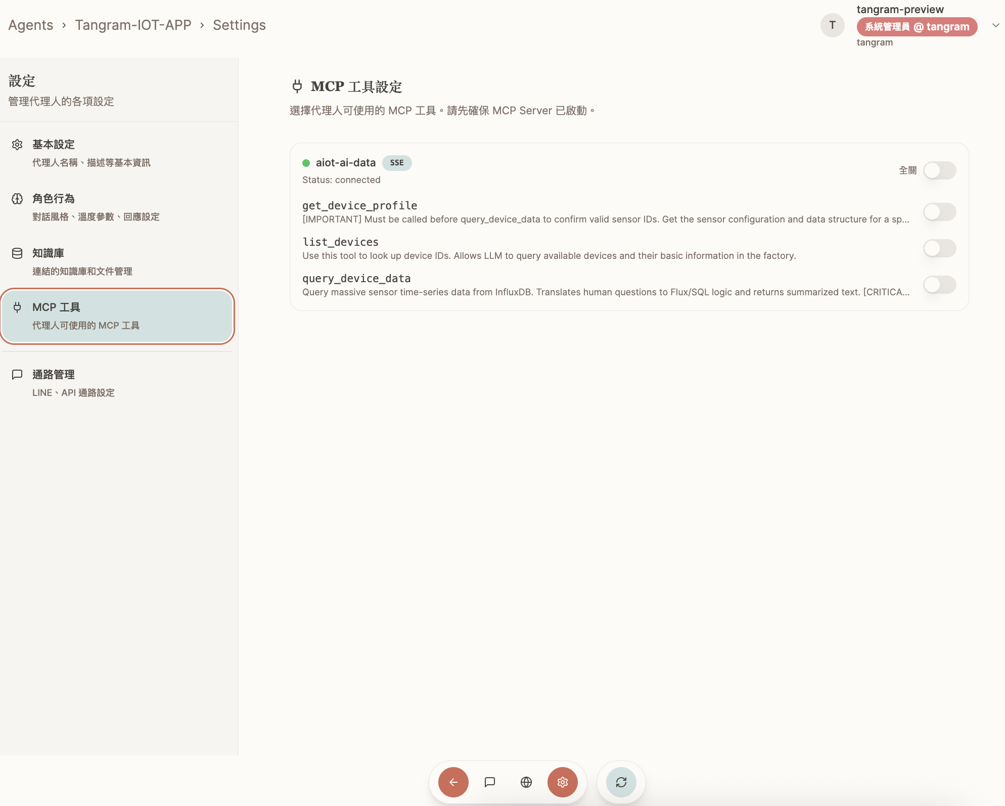 MCP 工具提供 Agent 有能力串接外部資源來提供更多功能的應用 (如: 查詢資料庫, 發送 email, 讀取雲端儲存空間等), 如何新增 MCP 工具, 請參考 “MCP 管理” 說明。