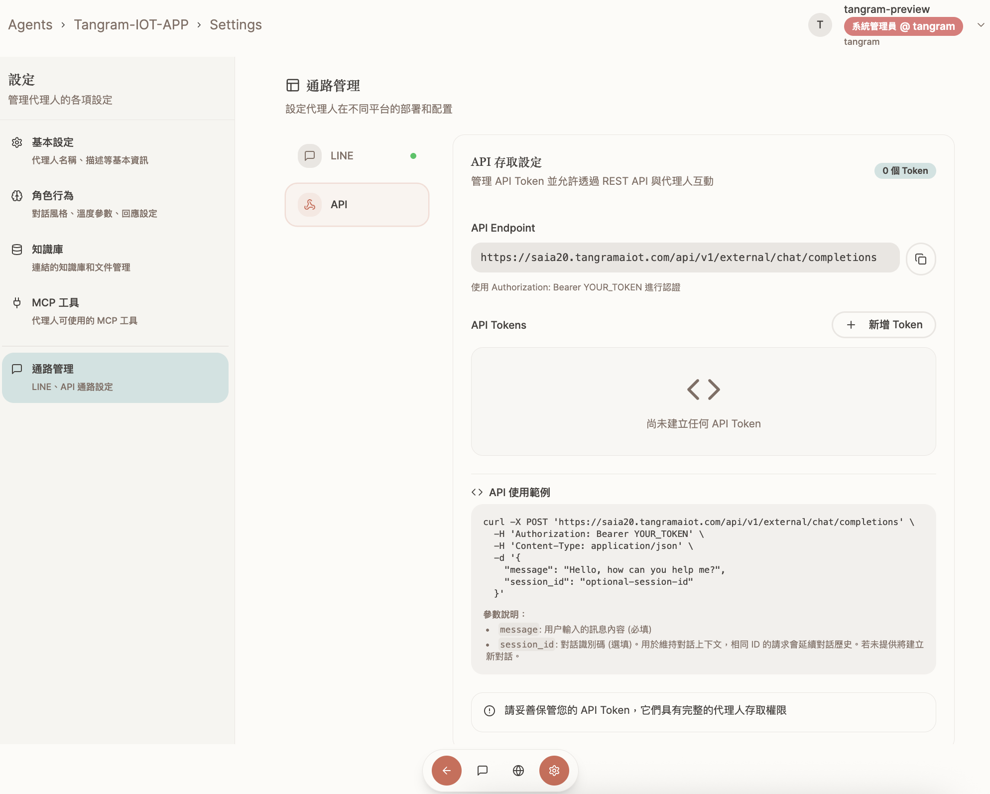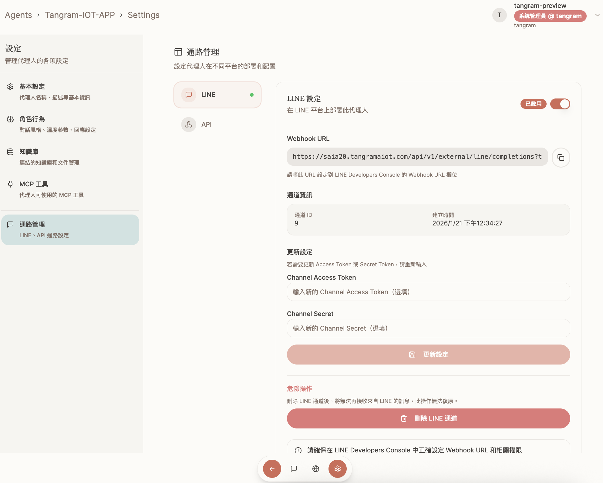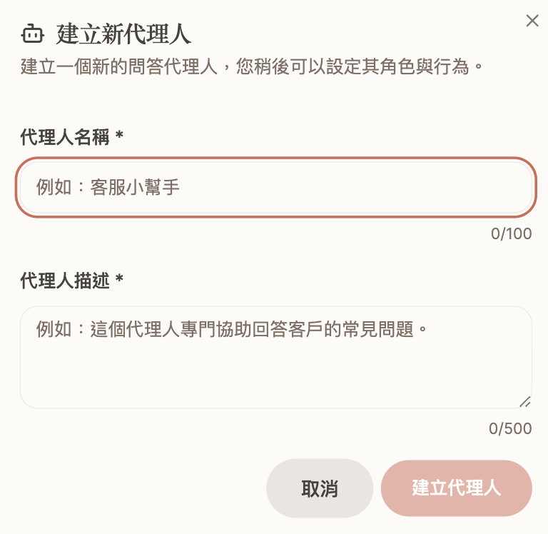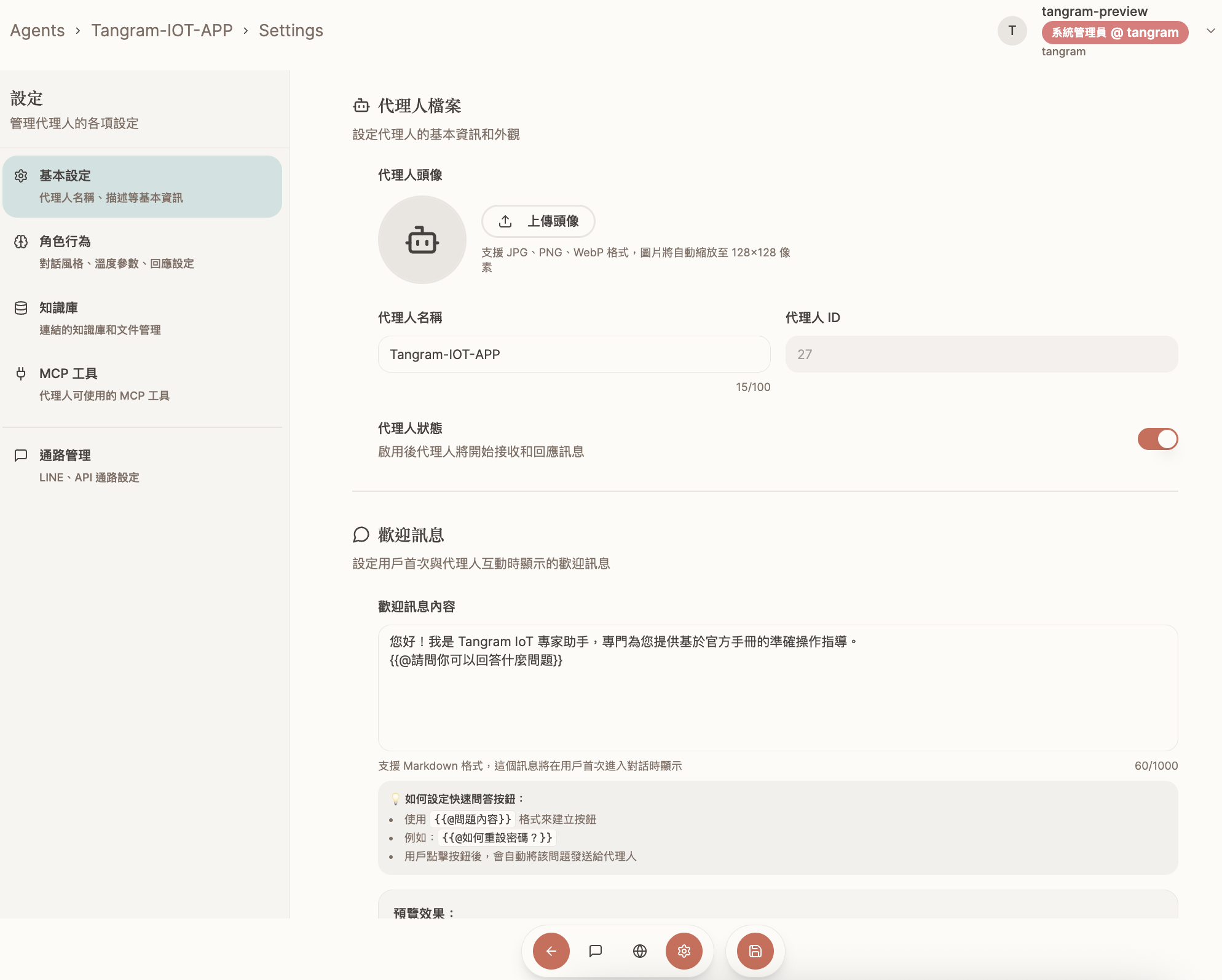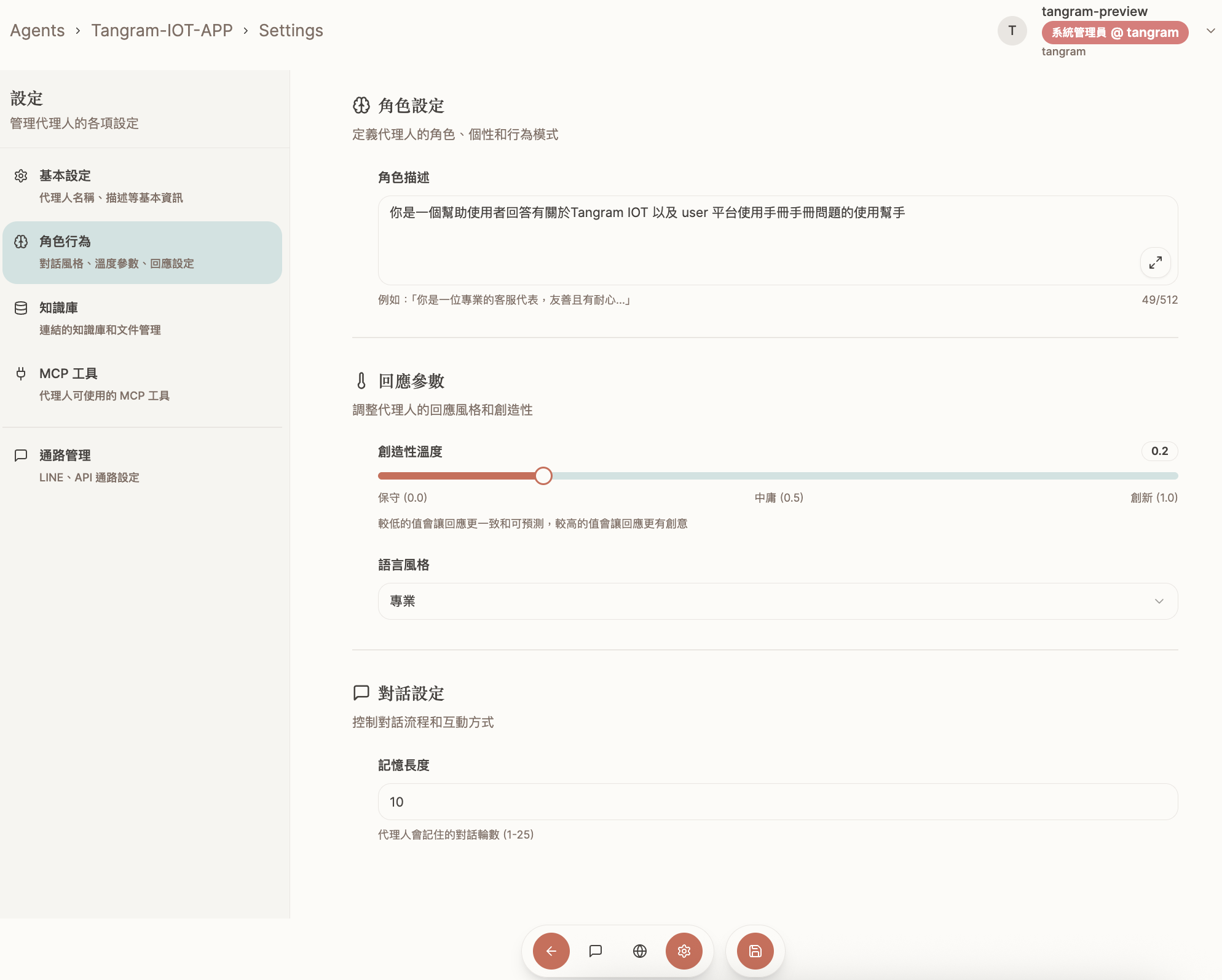 - 角色描述(Agent 提示詞): 設定聊天機器人的行為模式、語氣與角色定位。