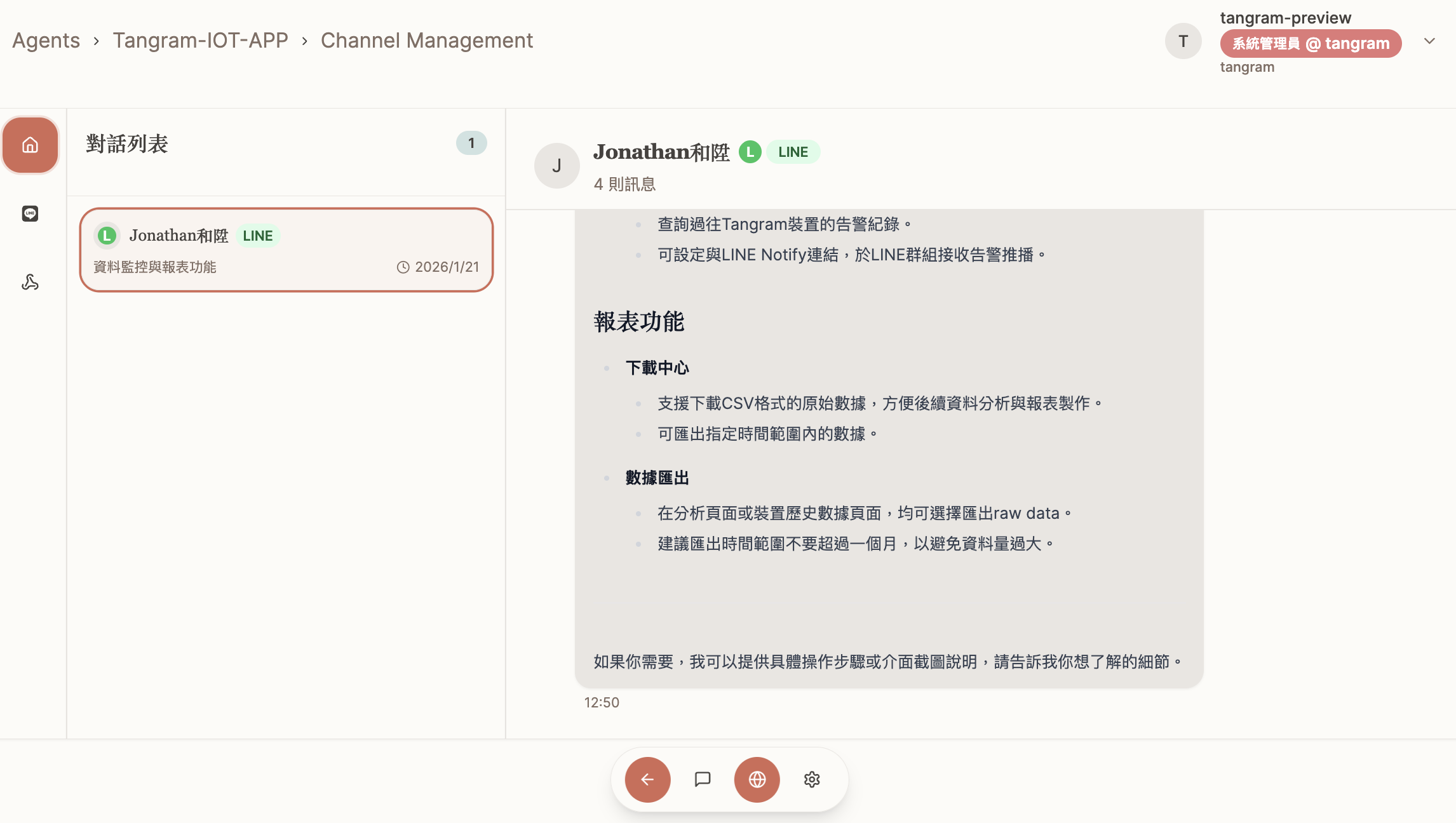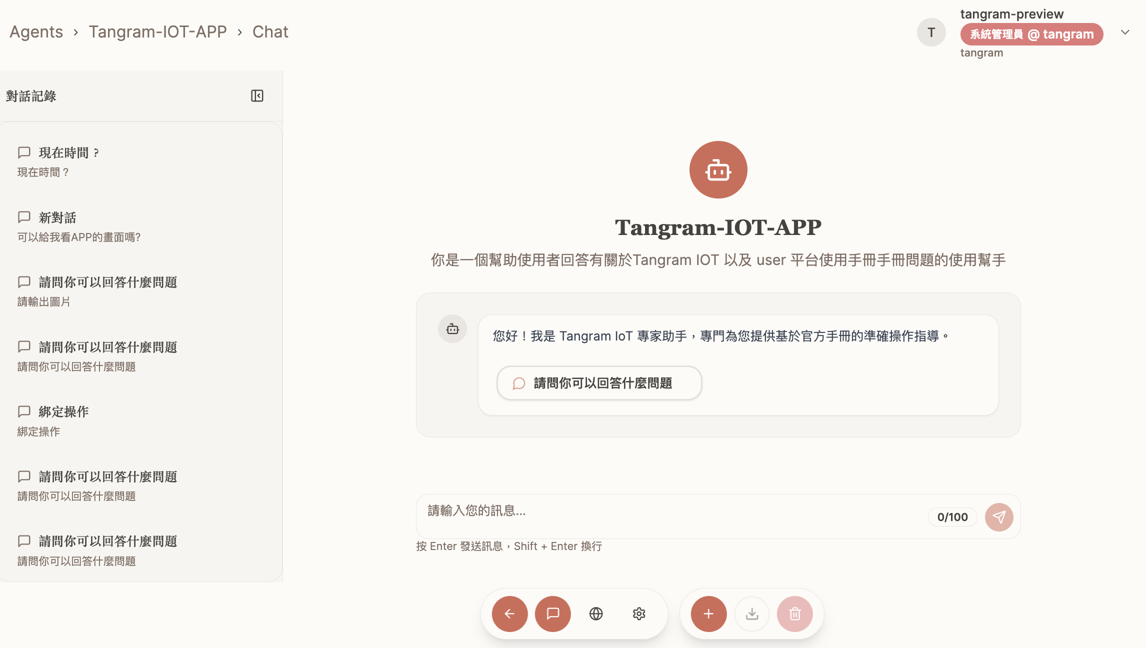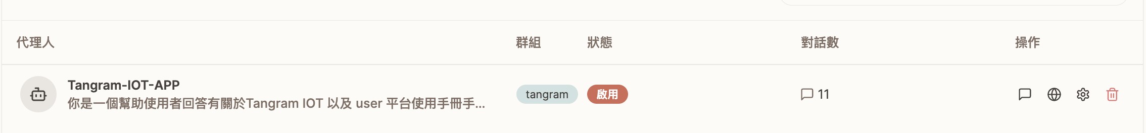 - 功能圖示(由左至右): 聊天功能、外部通道聊天記錄、設定、刪除聊天機器人。