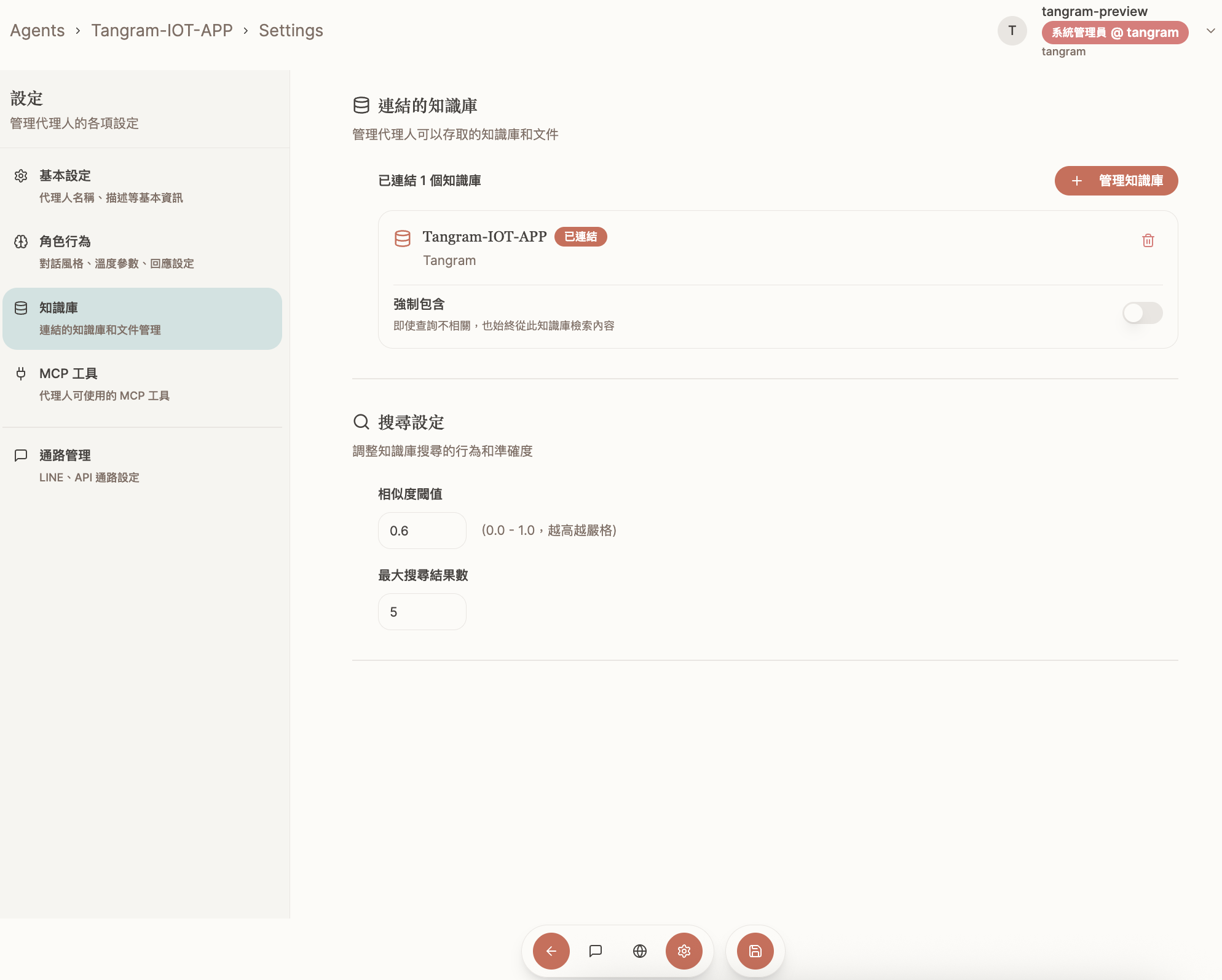 - 相似度閥值: 用來調整檢索知識庫時的相似度分數閥值。